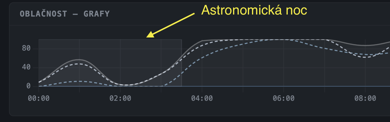 - Výpočet výšky Slunce nad obzorem — pro každou hodinu se spočítá, zda je Slunce níže než −18° (astronomická noc). Tyto hodiny jsou v grafech zvýrazněny šedým poloprůsvitným pruhem.