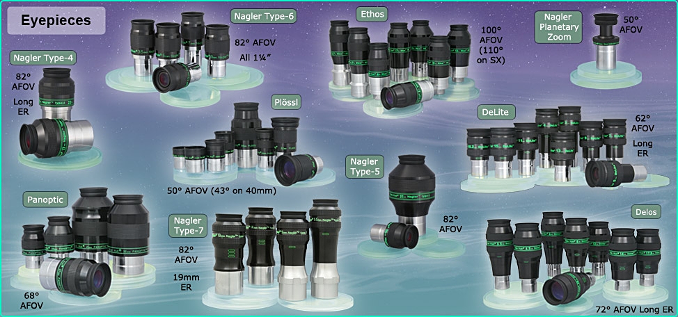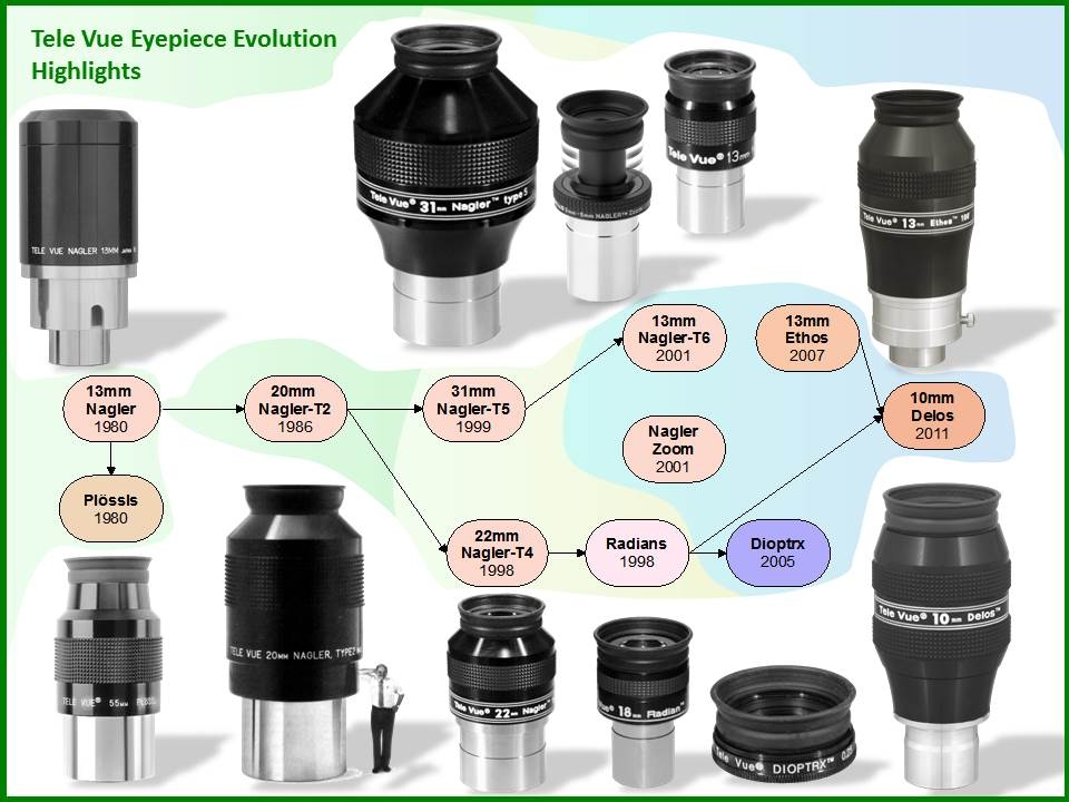 Z modernějších optických designů, s konstantní příznivou VVP ( cca 20mm ) napříč všemi ohnisky, máme na výběr hned tři ucelené řady odstupňované po 10° šířky pole - DeLite, Delos a Nagler ( T4, T5, T7 ). Extrémní Ethosy mají konstantní VVP rovnou 15mm.