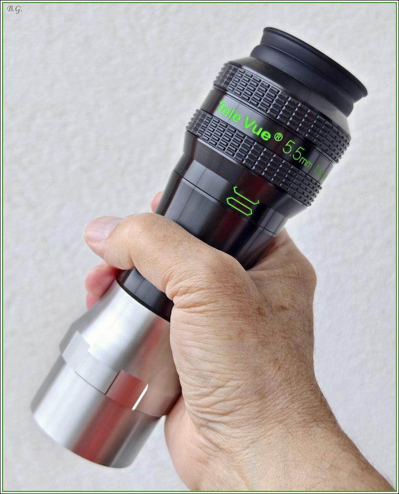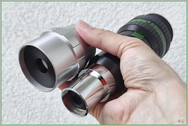 Mohutnost největšího okuláru 5,5 mm vynikne ještě víc, když ho vezmete do ruky... Jak je k tělu okuláru 2" barel uchycen, zjistíte až na druhý pohled, a to po jeho odšroubování - je totiž chytře zašroubován do filtrového závitu barelu 1,25".