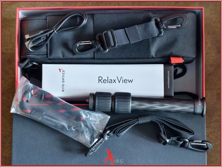 Základní příslušenství, které je předmětem dodávky, je velmi bohaté a umožní vám potenciál dalekohledu maximálně využít. Zaujal mne především mini-monopod, ukrytý v krabičce "Relax View". Dále pak šikovně provedené poutko a sada tří popruhů pro upnutí-zavěšení brašny s dalekohledem. Ohledně nabíjení se předpokládá, že vlastníte klasický síťový adaptér 5V/1,5A pro nabíjení smartphonů, a pod.