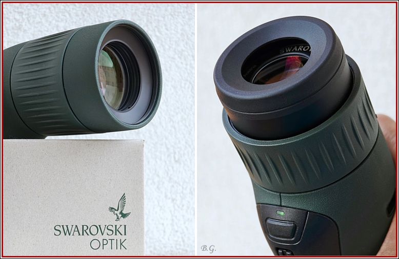 Velikost a hmotnost je velmi podobná a stejné se dá říct o parametrech zoom-okuláru. Swarovski má o něco větší rozsah směrem k malým zvětšením, což je vítané. Má příznivější hodnotu vzdálenosti výstupní pupily a zaostří na kratší vzdálenost. Zdánlivé zorné pole okuláru je při maximálním zvětšení o něco menší. I zde je objímka objektivu osazena praktickým fotografickým závitem.