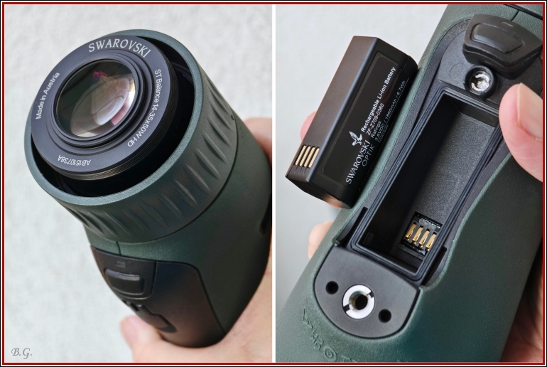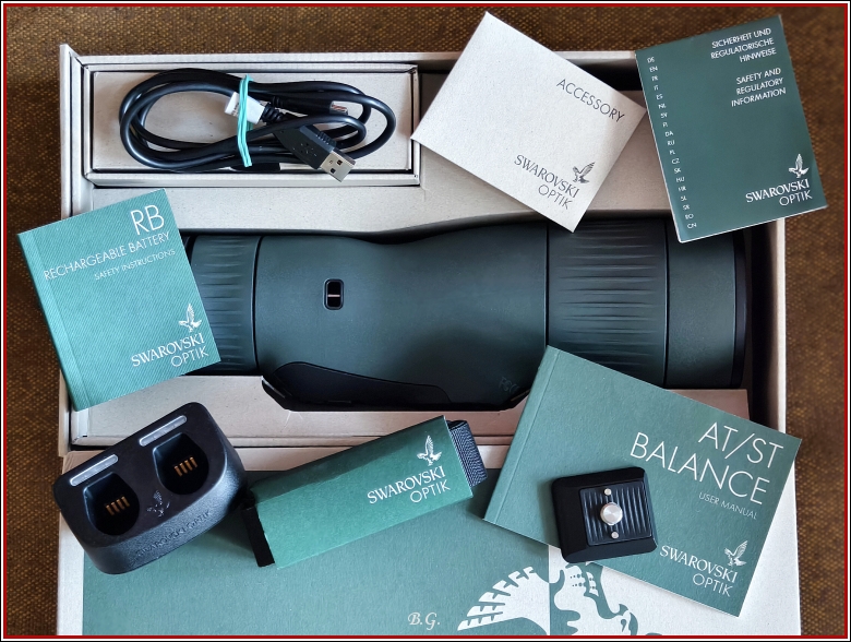 S baterií je to stejná situace, jako když jsem u NL Pure triedrů kritizoval náhradu standardizovaného závitu pro upevnění stativového držáku za menší, abyste museli koupit tento úchyt od Swarovského za téměř 200 €. Dodaný "Baterry Charger" je pasivní stojánek, ke kterému si musíte opatřit adekvátní zdroj s USB-A výstupem. Takže v tuto chvíli jste na tom úplně stejně, jako u spektivu z Belgie. S výhodou, že u Swarovského si tu jeho "originální" baterii aspoň můžete koupit. Příručka s bezpečnostními instrukcemi k baterii je stejně "tlustá", jako knížečka k obsluze dalekohledu, ale kolik hodin vydrží v dalekohledu, tam nenajdete... Není to ani v manuálu, po delším hledání na webu jsem tuto hodnotu objevil - je to 12 h. V balení dále potěšila stativová destička standardu "Arca-Swiss", která je vylepšená o kolíčky zabraňující její otáčení. Posledním kouskem základní výbavy je čistící utěrka na optiku.