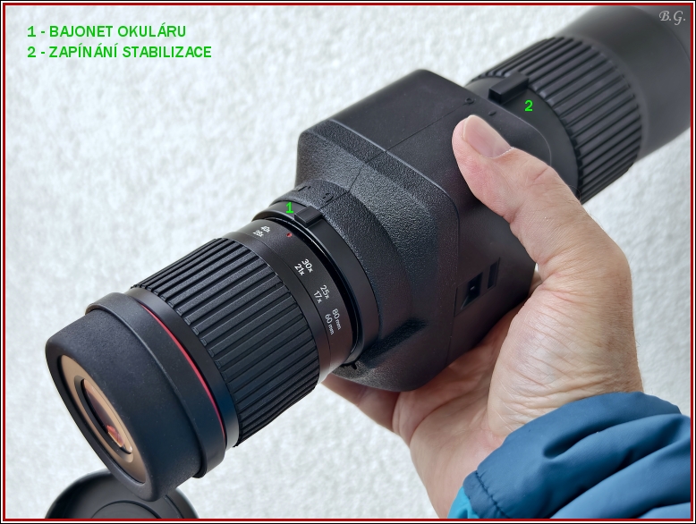 Na obrázku níže je vyznačen upínací prstenec zoom-okuláru a také prstenec pro zapínání stabilizace :